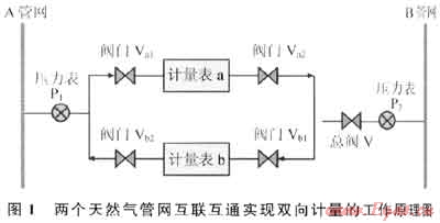 圖1是兩個(gè)天然氣管網(wǎng)互聯(lián)互通實(shí)現(xiàn)雙向計(jì)量的工作原理圖。