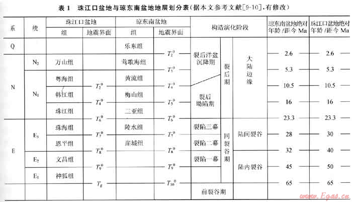 據(jù)鉆井及地震資料揭示,南海北部陸緣盆地新生代沉積地層自下而上可劃分為:前古近系基底,古近系古新統(tǒng)、始新統(tǒng)及漸新統(tǒng),新近系中新統(tǒng)、上新統(tǒng),第四系。盆地構(gòu)造演化階段經(jīng)歷了古近紀(jì)裂陷階段(具體可劃分為3個裂陷幕),新近紀(jì)-早、中中新世裂陷后坳陷階段及晚中新世第四紀(jì)裂陷后洋盆沉降期3個階段(表1)。