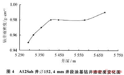 根據(jù)各井儲層孔隙壓力情況及安全鉆井密度窗口,選擇密度合適的VERSACLEAN油基鉆井液。以A12Sah井為例,該井儲層段采用密度為0.95g/cm3高油水比油基鉆井液開鉆,隨著現(xiàn)場鉆井過程中屏蔽暫堵材料的不斷補充及鉆屑固相含量的增加,至該井段完鉆時鉆井液密度為0.99g/cm3(圖4)。