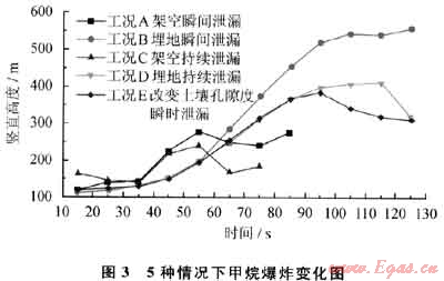 3) 管道泄漏爆炸范圍:埋地管道(工況B、D、E)泄漏爆炸范圍大且影響時間長,呈指數增加達到一定高度后不再升高,隨氣體擴散濃度減低至爆炸下限外;架空瞬間及持續(xù)泄漏爆炸范圍在85s前增加且高度比埋地管道泄漏高,85s后降低;孔隙度越大其影響范圍越小。