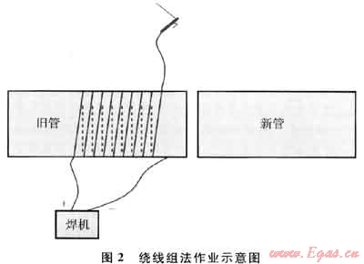 用直流電焊機(jī)的手焊鉗線在帶磁管道上順時(shí)針或反時(shí)針纏繞若干圈,纏繞匝數(shù)根據(jù)管道的磁場(chǎng)強(qiáng)弱決定,一般選用8~10圈為宜,其作業(yè)示意圖如圖2所示。繞線時(shí)如發(fā)現(xiàn)管口磁性變大,則需全部拆除,重新反向纏繞。