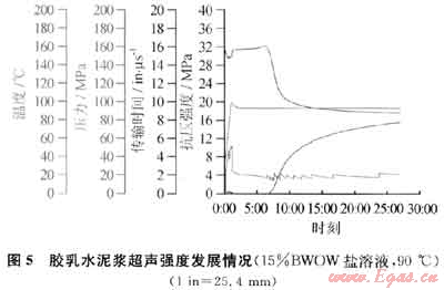 據(jù)本文參考文獻(xiàn)[5]報道,鹽摻量大于10%時以上時會造成水泥石早期強度損失,其強度明顯下降。因此,必須考慮含鹽膠乳水泥漿的強度發(fā)展情況。耐鹽膠乳水泥漿在90℃下的超聲強度發(fā)展眙線如圖5所示。從圖5可以看出,膠乳水泥石24h抗壓強度大于14MPa。