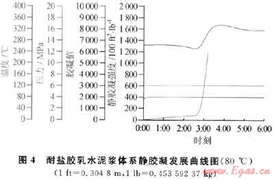 氣井固井的主要風(fēng)險之一是發(fā)生環(huán)空氣竄。嚴(yán)重的環(huán)空氣竄可能導(dǎo)致很高的井口壓力和氣體流動,不僅使后續(xù)鉆井工程和開采工程無法進(jìn)行,還可能造成全井報廢的惡果。根據(jù)Sabins理論,水泥漿的防氣竄性能可以通過參數(shù)“過渡時間”來預(yù)測,該時間越短防氣竄性能越好[6]。耐鹽膠乳水泥漿體系在80℃的靜膠凝強度發(fā)展情況如圖4所示。從圖4可以看出,水泥漿體系過渡時間較短(為20min),有助于防止氣竄的發(fā)生。