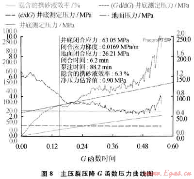 主壓裂實際入井液量385.0m3,加入粉陶4.4m3、30~50目陶粒30.4m3、20~40目陶粒9.3m3,最高砂比35%,平均砂比20.6%。主壓裂G函數分析曲線如圖8所示。