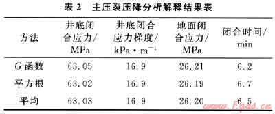 對主壓裂分別進行停泵壓力分析、壓降G函數分析和壓降雙對數分析以及平方根分析,井底閉合應力梯度為16.9kPa/m,地面閉合壓力為26.2MPa,閉合時間為6.5min(表2)。