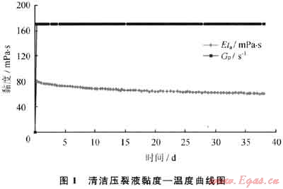 為確保壓裂液質量,分別取配液站配制和現場配制壓裂液采用HAAKE-VT550流變儀進行實驗評價(圖5、6)。由圖可見,采用配液站罐內水配制的清潔壓裂液黏度比配液站清水配制的清潔壓裂液黏度低50%(從60mPa·s下降至30mPa·s),說明水質對清潔壓裂液黏度影響很大,但仍能滿足壓裂要求。