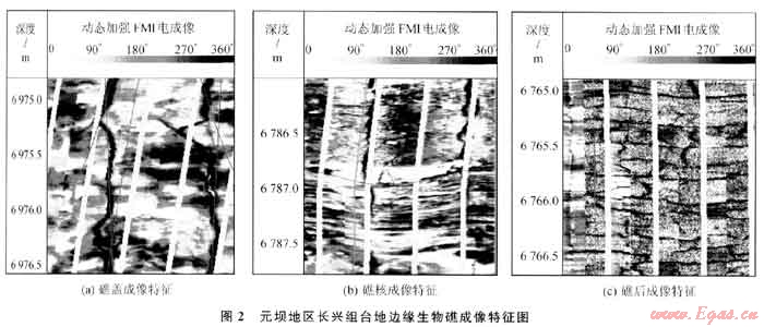 研究區(qū)大部分井都已取全取準(zhǔn)了成像測井資料,利用成像測井對元壩地區(qū)長興組礁灘相儲(chǔ)層的沉積微相做進(jìn)一步刻畫顯得尤為重要。通過對本區(qū)鉆井的成像測井信息與沉積微相的地質(zhì)信息進(jìn)行對比分析表明,礁蓋、礁核是最有利于元壩長興組礁灘相優(yōu)質(zhì)儲(chǔ)層發(fā)育的沉積微相。