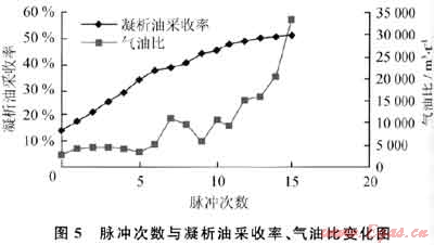 圖5為脈沖次數(shù)與凝析油采收度、氣油比的變化關(guān)系,在31MPa開始進行脈沖注氣,雖然脈沖壓力波動范圍都是25%,但由于建立了單向流動通道,因此采收率相對較高,脈沖很多次后仍有一定油量采出,在進行15次脈沖時,油采出程度51.23%,增加凝析油采收率37.62%。說明在裂縫孔洞型碳酸鹽儲層中,建立注采循環(huán)系統(tǒng)后,有壓力脈沖可使部分凝析液得到反蒸發(fā),從而比最大凝析油飽和度下注氣凝析油采收率提高了4%左右。