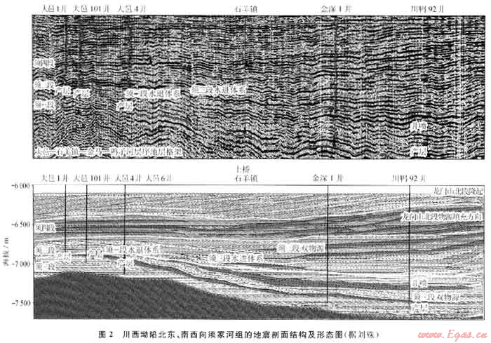 據(jù)龍門山前緣坳陷內(nèi)的地震測(cè)線,在T52轉(zhuǎn)換面上、下,存在兩種不同的反射波組和盆地結(jié)構(gòu),須上盆由NE→SW前積,須下盆由SW→NE前積,表征了坳陷內(nèi)物源分別來(lái)自米倉(cāng)山、大巴山與康滇古陸,沉積中心在彭州鴨子河一帶,相帶展布見(jiàn)圖2。