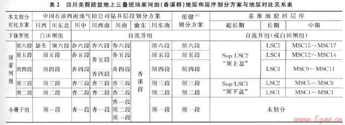 由于控制四川盆地構(gòu)造-沉積格局的龍門山和米倉山-大巴山兩條造山帶逆沖推覆活動的非同步性和異方位性[5~6],須家河期的沉積充填作用于盆地各部位也是不同步和非均衡的,在地層表現(xiàn)形式上,如地層厚度、巖性、巖相、疊置方式和物源供給方向都存在很大的差異性,致使盆地范圍內(nèi)須家河組很難進(jìn)行統(tǒng)一地層劃分和區(qū)域?qū)Ρ?。但依?jù)上述各次級構(gòu)造單元須家河組層序發(fā)育特征,筆者采用高分辨率層序地層學(xué)理論和層序分析與對比技術(shù)[19],從盆-山耦合過程的構(gòu)造-沉積序列分析和旋回等時對比法則入手,在對各次級構(gòu)造單元須家河組進(jìn)行層序劃分和發(fā)育特征描述的基礎(chǔ)上,建立貫穿盆地的層序 地層和時間-地層格架,從層序演化規(guī)律和旋回等時性分析角度出發(fā),對須家河組進(jìn)行了更為合理的統(tǒng)一劃分和區(qū)域地層對比取得較好效果(表2),也為編制須家河組更精細(xì)的層序-巖相古地理圖[16]和描述層序充填樣式與氣藏分布關(guān)系[20]提供了更為有效的基礎(chǔ)資料。
