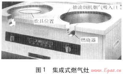 近幾年來,市場上出現(xiàn)了一種集成式燃?xì)庠?,這種燃?xì)庠钭畲蟮奶攸c(diǎn)是,將抽油煙機(jī)煙氣吸入口與燃?xì)庠罱嚯x地集成在一起,見圖1。集成式燃?xì)庠畹某橛蜔煓C(jī)煙氣吸入口呈環(huán)型分布在燃燒器頭部的側(cè)上方,從炊具的側(cè)面吸走煙氣。