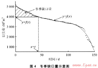 式中Qt為冬季缺口氣量,104m3;f(t)=qmax為上游供氣管網的最大日負荷,104m3,也就是直線x=t和曲線y=f(x)交點的縱坐標值。