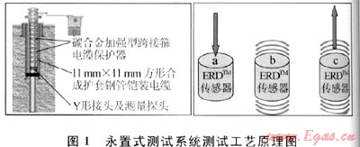 永置式測試系統(tǒng)工作原理是地面系統(tǒng)通過井下電纜給傳感器提供一個(gè)毫伏級的電壓信號,ERD傳感器產(chǎn)生與周圍環(huán)境壓力及溫度相關(guān)的頻率響應(yīng)信號,頻率響應(yīng)信號再通過電纜傳送至地面采集系統(tǒng)被轉(zhuǎn)為壓力溫度讀數(shù)。