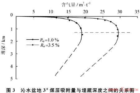因此,影響煤層吸附能力的主要因素是煤階、溫度和壓力。在正常地溫梯度下,埋深1500m以淺的煤層吸附能力主要受壓力控制,在這個(gè)深度范圍煤層吸附能力達(dá)到最大值之后隨著埋深加大含氣量具有降低的趨勢(圖3)[39]。因此,煤層含氣量主要受到溫度壓力場的控制。