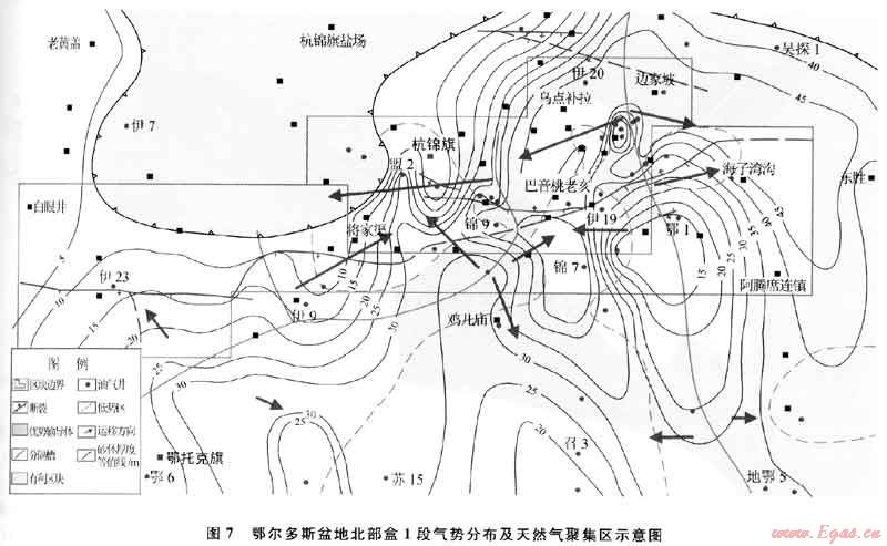 常規(guī)油氣圈閉機(jī)制是在儲層中有被油氣高等勢面封閉形成的油氣低勢區(qū),這種低勢區(qū)是一個(gè)孔隙、滲透性巖體,是聚集、保存油氣的場所,位置具有明顯的可預(yù)測性。這說明,常規(guī)油氣的聚集取決于油氣勢的太小,高部位一般具有低油氣勢,是油氣運(yùn)移的指向,目此,常規(guī)油氣主要聚集于背斜構(gòu)造。常規(guī)天然氣在運(yùn)移過程中主要受浮力、毛細(xì)管力和地層水的水動(dòng)力3種作用力的共同控制。天然氣在地層中不同位置的勢能不同,由于氣勢梯度的存在,天然氣會沿著氣勢減』、的最大方向(負(fù)氣勢梯度方向)從高氣勢區(qū)向低氣勢區(qū)運(yùn)移(圖6)。運(yùn)移的結(jié)果是天然氣進(jìn)入自身勢能最1、的區(qū)域后不再發(fā)生運(yùn)移,達(dá)到平衡狀態(tài)后聚集成藏。如通過對鄂爾多斯盆地北部二疊系石盒子組盒1段氣勢的分析發(fā)現(xiàn),天然氣聚集區(qū)主要發(fā)育于低氣勢區(qū)(圖7)。
