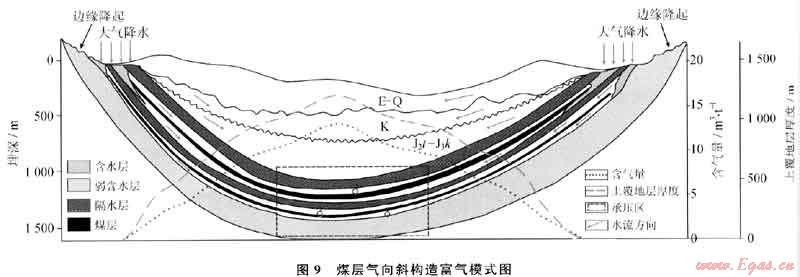 通過對國內(nèi)外煤層氣富集規(guī)律的研究,發(fā)現(xiàn)了自斜構(gòu)造富集煤層氣這一普遍特點(diǎn),如美國圣湖安盆地、我國沁水盆地等都可見到這一現(xiàn)象[41~43](圖8)。煤層氣向斜富集規(guī)律并非偶然,取決于煤層氣特殊的賦存方式。由于煤層氣的賦存絕大部分是吸附氣,煤吸附煤層氣屬于物理吸附,從Langmuir等溫吸附方程可知,煤的吸附量隨壓力增大而增大。因此,要保持煤層中有足夠大的吸附量,低水勢和高壓力是主要的前提條件。向斜軸部位于地層下傾部位,地層水位低,使煤層處于承壓水環(huán)境,壓力得到保存;另一方面,向斜軸部一般位于盆地深部,靜水壓力較大,具有較高的地層壓力。因此,由于水勢和壓力的共同作用,使向斜軸部不僅可以保持較高的壓力條件滿足煤層的最大吸附,而且大氣滲入水體在軸部形成向心流,也能起到水封的效果,對煤層氣的保存有利,在向斜部位更容易吸附煤層氣而富集成藏。