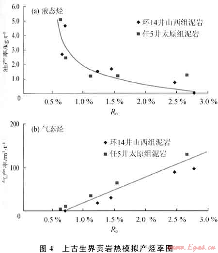 鄂爾多斯盆地環(huán)14井山西組頁巖和任5井太原組頁巖的熱模擬實驗結(jié)果表明(圖4):Ro<0.7%時,幾乎沒有氣態(tài)烴產(chǎn)出;Ro介于0.7%~1.1%時,液態(tài)烴產(chǎn)率隨Ro增大迅速下降,而氣態(tài)烴產(chǎn)率則迅速增大,但產(chǎn)率數(shù)值還很小;Ro>1.1%時,液態(tài)烴產(chǎn)率隨Ro增大緩慢下降,而氣態(tài)烴產(chǎn)率隨R,增大迅速增大;Ro為2.5%時的氣態(tài)烴產(chǎn)率達到110m3/t(有機碳)。從該區(qū)上古生界頁巖的Ro大都超過1.1%可見,上古生界頁巖以生成氣態(tài)烴為主,僅有少量液態(tài)烴。