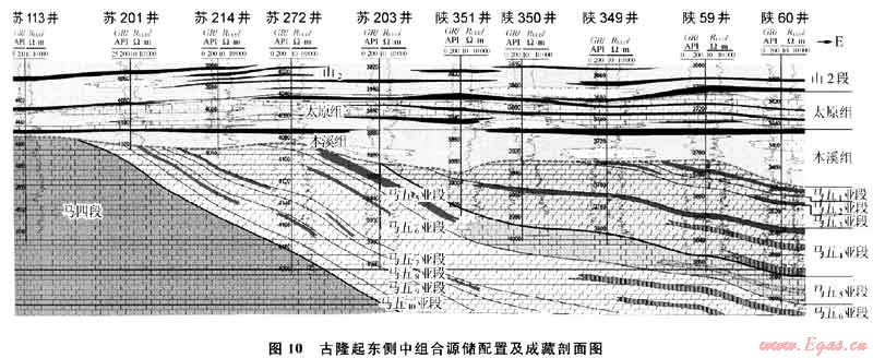 晚石炭世盆地整體沉降后,鄂爾多斯地區(qū)又開始接受石炭-二疊紀海陸交互相及陸相沉積,使上古生界的煤系地層在該區(qū)與奧陶系中組合及下組合地層直接接觸。到印支末燕山期,隨著上古生界煤系烴源巖熱演化成熟進入烴類氣體的大量生成階段后,即可對下古生界的奧陶系中組合及下組合儲層供氣,構(gòu)成良好的源儲配置關(guān)系(圖10)。