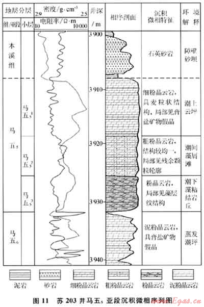 其次,從大的巖性帶內(nèi)部來看,也存在次一級的巖性變化(即沉積微相類型的變化)。按照Walther相律的原理[16],在連續(xù)發(fā)育的地層序列中,縱向上連續(xù)的沉積必然在橫向上相鄰,因此通過對蘇203井等馬五5沉積微相序列的分析(圖11),就可以初步確定馬五5地層在鄰近區(qū)域橫向相鄰的微相變化規(guī)律,蘇203井區(qū)馬五5主力儲層段發(fā)育在中部(馬五52)的藻屑灘相白云巖中,其下部(馬五53)的藻粘結(jié)巖丘白云巖和上部(馬五51)的潮上蒸發(fā)云坪白云巖,則分別代表了其東側(cè)和西側(cè)相鄰的微相環(huán)境,即在大的白云巖分布區(qū)帶內(nèi),可進一步細分出顆粒灘及灘間低能環(huán)境的沉積類型。它們雖同為白云巖,但由于沉積微相環(huán)境及成巖作用特征不同,因而具有不同的物性特征,并進而構(gòu)成次一級的巖性相變特征。