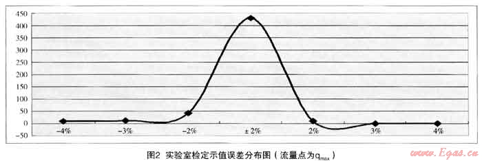 可以看出:對于qmax流量點,實驗室檢定示值誤差在±2%以內的為429臺,比例84%,示值誤差在±3%以NN為479臺,比例93.8%,±4%以內的為490臺,比例96%,如果按照±4%為合格區(qū)間,則現(xiàn)場檢定的儀表合格率可達95%以上,說明近95%的儀表是合格的,可以繼續(xù)使用。圖2所示的曲線是一個典型的正態(tài)分布,其數(shù)值的絕大部分(96%)都在合格區(qū)間內。