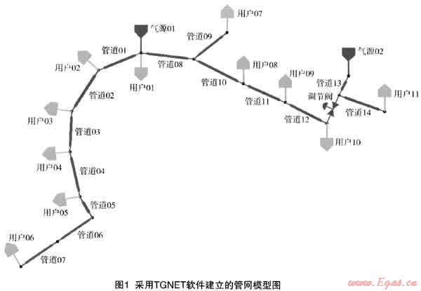 本文所采用的TGNET軟件是英國(guó)ESI能源集團(tuán)開(kāi)發(fā)出品的業(yè)界領(lǐng)先的Pipeline Studio軟件,是經(jīng)過(guò)使用證明的、歷史悠久的氣體管道離線模擬軟件,能夠?qū)敋夤艿乐械膯蜗嗔鬟M(jìn)行穩(wěn)態(tài)模擬和動(dòng)態(tài)模擬;可以模擬簡(jiǎn)單的單管輸送模型,也可以模擬包括多個(gè)氣源和用戶,多個(gè)復(fù)雜的環(huán)狀管網(wǎng)、多臺(tái)壓縮機(jī)和冷卻器以及其他影響管網(wǎng)操作和運(yùn)行參數(shù)的設(shè)備閥門等在內(nèi)的大型區(qū)域性集輸系統(tǒng),已經(jīng)在全世界得到了廣泛的應(yīng)用。