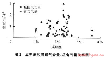 中國海相頁巖具有成熟高的特點(圖1),以中國南方地區(qū)下寒武統(tǒng)黑色頁巖為例,大部分地區(qū)的成熟度大于3%,處于過成熟晚期階段,局部地區(qū)的成熟度均超過4%,達到變質期,失去生氣能力[9~11]。雖然局部地區(qū)的成熟度偏高,但是高的有機碳含量預示著這些層位可能是頁巖氣發(fā)育的有利層位,如在黔中隆起的方深1井的下寒武統(tǒng)牛蹄塘組,成熟度(Ro)高達5.5%,有機碳含量高達8.02%,對牛蹄塘組黑色頁巖的壓裂測試表明,仍有天然氣產出。因此,不難看出即使是高成熟度的頁巖,也可能有天然氣賦存。總體來講,高成熟度對頁巖氣藏來說是不利的,在高成熟度條件下,主要看頁巖保存條件的好壞,如果保存條件好,即使成熟度高也能形成頁巖氣藏。筆者對四川盆地及其周緣下寒武統(tǒng)和上奧陶統(tǒng)-下志留統(tǒng)41塊黑色頁巖的成熟度和含氣量的關系可以看出,成熟度(Ro)介于1.1%~3.0%時,吸附氣含量達到最大值區(qū)域,平均超過1m3/t,最大超過2m3/t,總含氣量也達到最大值區(qū)域,平均超過2m3/t。在小于1.1%和大于3.0%時,吸附氣含量和總含氣量均有不同程度的降低,前者因為處在生油窗(濕氣),生氣量有限且溶解于石油中,后者成熟度過高,生氣能力有限,均導致吸附氣含量不高(圖2)。無論成熟度高低,在頁巖層中,均有天然氣賦存,甚至形成頁巖氣藏。