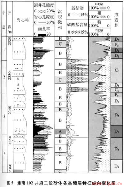 須二段大型復(fù)合砂體主要由4期河道遷移擺動形成的砂體組成,縱向上不同時期沉積砂體之間或同期砂體內(nèi)部的沉積韻律、微相組合、膠結(jié)物類型及其含量、成巖相類型及其組合以及孔隙度和面孔率等存在明顯差異,非均質(zhì)性較強(qiáng)。圖5為潼南102井須二段復(fù)合砂體沉積微相、成巖相和孔隙度的縱向變化圖,可見河道滯留微相(A)和砂壩相砂體(B)主要由粗粒或中粒砂組成,發(fā)育強(qiáng)溶蝕成巖相(D1)和中溶蝕成巖相(D2和D3),對應(yīng)的巖心孔隙度可超過7%,而溢流砂坪相砂層(C)及其上下地層由細(xì)粒粉砂和泥巖組成,常見機(jī)械壓實致密成巖相(Pc)和碳酸鹽充填成巖相(Cc),對應(yīng)孔隙度在2%~5%,以上現(xiàn)象說明沉積微相、成巖相和儲層物性三者之間的關(guān)系密切,儲層物性明顯受沉積微相和成巖相雙重控制,其中河道粗粒砂巖原生孔隙發(fā)育,有利于各類溶蝕作用的產(chǎn)生,形成中低孔滲儲集體,造成儲層非均質(zhì)性強(qiáng)。