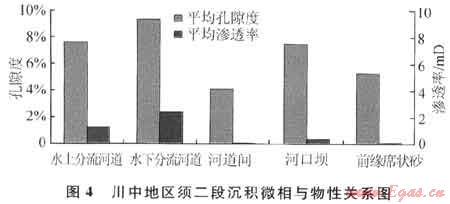 物性分析結(jié)果也顯示不同沉積微相的砂巖孔隙度和滲透率差異明顯(圖4),河道微相和砂壩相砂體與溢流砂坪相砂體相比,其平均滲透率級差可為2~3倍。利用300個巖樣滲透率分析的結(jié)果,結(jié)合前人對須二段物性分析的成果,繪制須二段滲透率平面分布圖,發(fā)現(xiàn)中高孔滲帶(孔隙度大于8%、滲透率大于0.1mD)主要沿主河道或次水道的流向分布,其中滲透率介于1~10mD的儲層面積約占整個砂體平面分布12%,滲透率為1~0.1mD的儲層面積約占整個砂體平面分布65%,滲透率為0.1~0.01mD的儲層面積約占整個砂體平面分布15%,滲透率小于0.01mD的儲層面積約占整個砂體平面分布8%,以上說明須二段儲層的平面非均質(zhì)性較強(qiáng)。