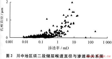 川中及川中-蜀南過渡帶須二段巖石類型主要為長石巖屑砂巖,含少量巖屑砂巖和長石石英砂巖,石英和巖屑含量中等,長石含量相對較高,分別平均為61.45%、1.97%和10.51%;其砂巖孔隙類型主要為粒間、粒內(nèi)溶孔、綠泥石襯邊的溶蝕孔和石英次生加大后的殘余粒間,以及少量雜基孔和微裂縫,面孔率約為10.73%,孔隙結(jié)構(gòu)以中孔細(xì)喉為主,局部發(fā)育小孔細(xì)喉和大孔細(xì)喉型組合。大量須二段巖心壓汞分析統(tǒng)計結(jié)果顯示(圖2),須二段砂巖的孔隙結(jié)構(gòu)非均質(zhì)性較強(qiáng),喉道直徑分布在0~2μm,變化范圍較大,其中直徑小于0.5μm的微孔喉和小孔喉體積分別占總體積的75%左右,大孔喉發(fā)育較少,并且當(dāng)孔喉直徑小于0.5μm時,滲透率隨孔喉直徑變化呈指數(shù)函數(shù)增長,對滲透率的影響較為敏感。