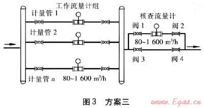 ③ 城市天然氣門站計量系統(tǒng)的設(shè)計方案還要充分考慮城市經(jīng)濟(jì)發(fā)展對天然氣供氣設(shè)備擴(kuò)容的需求。如果選用渦輪流量計或超聲流量計作為工作流量計,則應(yīng)該考慮在圖3方案三的工作流量計組中預(yù)留擴(kuò)展旁路。如果選用標(biāo)準(zhǔn)孔板流量計作為工作流量計,這種流量計在雷諾數(shù)符合要求的前提下,可以通過擴(kuò)大開孔直徑、調(diào)整差壓上限等方法,在一定范圍內(nèi)解決擴(kuò)容的問題。