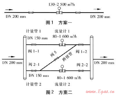 圖1、2為某城市天然氣門站計量系統(tǒng)工藝管路方案一和方案二。兩個方案相比較,方案一結(jié)構(gòu)簡單,工程造價較低,方案二則相反。但是,采用兩管并聯(lián)的方案二,可以使整個計量系統(tǒng)的測量范圍從130~2500m3/h(量程比20:1)擴(kuò)展到80~3200m3/h(量程比40:1)。在門站運行過程中,如果遇到流量波動較大時,方案二可以隨時打開或關(guān)閉兩臺流量計中的一臺,使流量計量儀表始終工作在0.2qmax到0.8qmax這一計量性能最優(yōu)的范圍段(qmax為最大流量),從而保證整個計量系統(tǒng)的計量性能最優(yōu)。另外在流量計1或流量計2中的某一臺出現(xiàn)故障或進(jìn)行周期檢定時,可以使用單臺流量計供氣運行的方式,避免城市門站供氣中斷的情況發(fā)生。