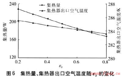 保持其他參數(shù)不變,集熱量、集熱器出口空氣溫度隨εp的變化見圖6。由圖6可知,隨著εp增大,吸熱板對環(huán)境的輻射傳熱增強(qiáng),熱損失增大,集熱量降低。由于吸熱板溫度降低,與空氣的對流傳熱減弱,因此集熱器出口空氣溫度降低。集熱量與集熱器出口空氣溫度降低的趨勢逐漸減緩,這是由于隨著吸熱板溫度的降低,熱損失的增長率也大大降低。
