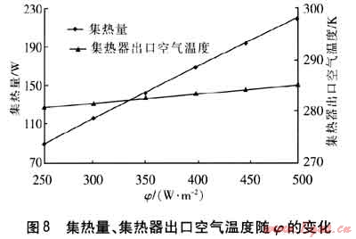 保持其他參數(shù)不變,集熱量、集熱器出口空氣溫度隨φ的變化見圖8。由圖8可知,隨著φ的增大,吸熱板溫度升高,與流道內(nèi)空氣的溫差加大,對流傳熱增強(qiáng),集熱器出口空氣溫度升高,集熱量也隨之升高。