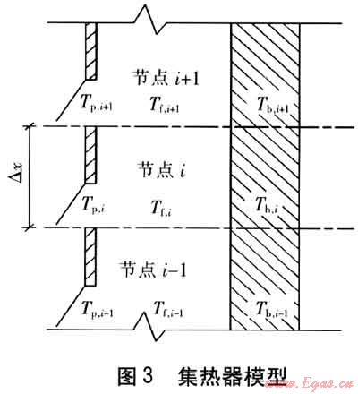 集熱器模型見圖3,基于有限差分的數(shù)值解法,將集熱器沿x方向分成n個節(jié)點(diǎn)。