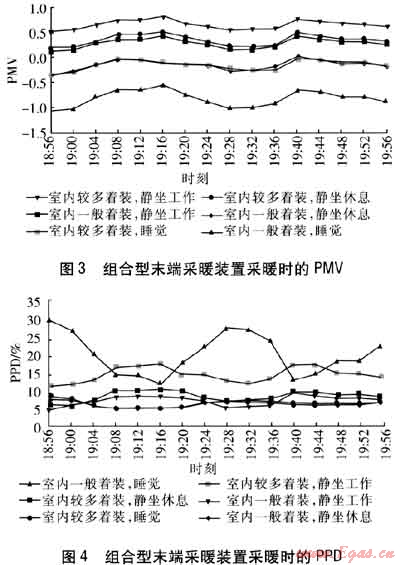 在實(shí)驗(yàn)室1中,采用組合型末端采暖裝置進(jìn)行采暖,開(kāi)啟供暖型風(fēng)機(jī)盤(pán)管的風(fēng)機(jī)中檔后進(jìn)行測(cè)試。當(dāng)CLO=1.0時(shí),當(dāng)人員靜坐休息時(shí),PMV的平均值為0.31,PPD的平均值為7.26%,滿足IS0 7730—2005對(duì)可接受熱環(huán)境的規(guī)定,即室內(nèi)熱環(huán)境滿足大部分人的舒適要求。靜坐工作時(shí),PMV的平均值為0.63,PPD的平均值為13.38%,人們需將較多著裝變?yōu)橐话阒b(CLO=0.7)。變?yōu)橐话阒b后,靜坐工作時(shí)PMV的平均值為0.28,PPD的平均值為6.87%;靜坐休息時(shí)PMV的平均值為-0.04,PPD的平均值為5.20%。此時(shí)靜坐工作和靜坐休息時(shí)的熱環(huán)境均符合IS0 7730—2005對(duì)可接受熱環(huán)境的規(guī)定??梢?jiàn)采用組合型末端采暖裝置采暖,既符合人們的日常行為習(xí)慣,又提升了人們的生活品質(zhì)。通過(guò)對(duì)幾年實(shí)測(cè)數(shù)據(jù)的分析,建議采用組合型末端采暖裝置時(shí),在進(jìn)行維持基礎(chǔ)室溫所需的散熱器面積計(jì)算時(shí),散熱器的散熱量宜取該房間室內(nèi)采暖設(shè)計(jì)熱負(fù)荷的40%。組合型末端采暖裝置采暖時(shí)的PMV、PPD分別見(jiàn)圖3、4。