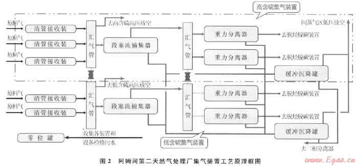 巴格德雷合同區(qū)域8區(qū)天然氣的含硫量不盡相同,按土庫曼斯坦當(dāng)?shù)氐沫h(huán)保標(biāo)準(zhǔn),當(dāng)硫化氫含量高于0.3%(體積分數(shù),下同)時天然氣處理廠的酸氣不能直接燃燒排放,需進行硫磺回收;當(dāng)硫化氫含量低于0.1%時酸氣可直接燃燒排放。因此,阿姆河第二天然氣處理廠集氣裝置也應(yīng)相應(yīng)考慮設(shè)置兩套既獨立又相互聯(lián)通的天然氣處理系統(tǒng)。阿姆河第二天然氣處理廠集氣裝置工藝原理框圖如圖2所示。