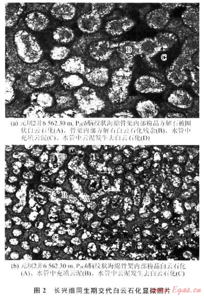 同生期成巖階段交代白云石化作用與沉積同時發(fā)生,白云石化作用受沉積微相控制,長興組沉積晚期由于沉積微相差異,元壩2井、元壩101井、元壩102井區(qū)處于臺地邊緣局限漏湖沉積微相環(huán)境,發(fā)生的混合水白云石化作用較強(qiáng),發(fā)育了一套同生期交代白云巖;而處在斜坡、陸棚沉積區(qū)的元壩4井區(qū),由于缺乏白云石化作用的環(huán)境[7~9],白云石化作用較弱,白云巖層不發(fā)育。同生期發(fā)生的白云石化和主要在同生期發(fā)生的混合水白云石化對長興組碳酸鹽巖儲層的發(fā)育具有重要意義。