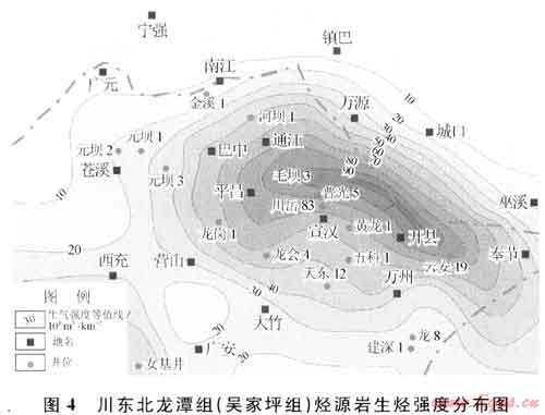 川東北地區(qū)龍?zhí)督M(吳家坪組)泥頁巖呈區(qū)域性分布,在元壩地區(qū)該地層過渡為吳家坪組。其暗色泥灰?guī)r及黑色泥質(zhì)巖厚40~80m;總有機(jī)碳含量值變化在0.27%~7.20%范圍,平均值為2.90%(元壩3井)。本區(qū)該套烴源巖有機(jī)質(zhì)類型以混合型為主,在早侏羅世進(jìn)入生油高峰期,中侏羅世末達(dá)到生氣演化期,現(xiàn)今實(shí)測(cè)Ro值大多在2%~3%之間,有機(jī)質(zhì)處于過成熟干氣演化階段,生氣強(qiáng)度主要分布在20×108~30×108m3/km2之間(圖4),具有形成大氣田的氣源條件。