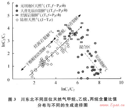 元壩氣田長興組儲(chǔ)層中普遍見有固體瀝青,表明地史上形成過古油藏并發(fā)生了原油裂解作用。根據(jù)大普光和通南巴地區(qū)實(shí)際氣藏分析資料的綜合對(duì)比及模擬實(shí)驗(yàn)數(shù)據(jù)[10],發(fā)現(xiàn)這兩類天然氣在lnC1/C2、lnC2/C3比值分布上有明顯差別(圖3)。烴源巖裂解氣的lnC1/C2值較低,大多在6.0之下;而lnC2/C3值較高,均在2.5以上,并隨熱演化程度的增加而變大。原油裂解氣的lnC1/C2值較高,大都在6.0以上;lnC1/C2值較低,大多在2.0之下,與前類天然氣形成區(qū)別。如圖3所示,元壩地區(qū)的飛仙關(guān)-長興組天然氣總體上呈高lnC1/C2、低lnC2/C3值的原油裂解氣組成特點(diǎn)。它們的lnC1/C2值基本上都在6.0以上,且多數(shù)氣樣lnC2/C3值低于2.5,由此可認(rèn)為主要來源于古油藏原油的裂解作用。同時(shí)在圖3中可觀察到,部分氣樣的lnC2/C3值高于2.5,近于烴源巖裂解氣的分布區(qū),意味著這些天然氣中部分氣源直接來自烴源巖。