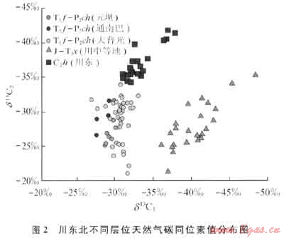 元壩地區(qū)長興組(包括少量飛仙關(guān)組)天然氣在化學(xué)組成上很干,甲烷在烴類中的相對(duì)含量大都在99.4%~99.9%之間;除個(gè)別氣樣外,C2以上重?zé)N少于1%,干燥系數(shù)在0.99以上,表明熱演化程度很高。該層系天然氣中甲烷碳同位素較重,δ13C1值集中在-27.5‰~ -30.5‰之間;乙烷碳同位素值變化較大,δ13C2值介于-25.0‰~-31.6‰,可能是受硫酸鹽熱化學(xué)還原作用(TSR)或成熟度的影響所致[5~6]。它們的甲、乙烷碳同位素值與大普光、通南巴地區(qū)的同層位氣層有相近的分布范圍,表明具有相同的氣源;而與深部下古生界石炭系黃龍組和淺部中、新生界陸相地層天然氣同位素組成差別較大(圖2)。