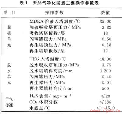 川渝地區(qū)某50×104m3/d天然氣凈化裝置采用典型的甲基二乙醇胺(MDEA)溶液吸收法脫除原料氣中的酸氣(主要為H2S和C02)成分,用三甘醇(TEG)溶液吸收法脫除水分,降低天然氣的露點。原料氣的組成為:CH4體積分?jǐn)?shù)為95.100%,C2H6體積分?jǐn)?shù)為2.122%,C3H8體積分?jǐn)?shù)為0.431%,C4H10體積分?jǐn)?shù)為0.123%,C5H12體積分?jǐn)?shù)為0.032%,C02體積分?jǐn)?shù)為0.180%,H2S體積分?jǐn)?shù)為1.900%,N2體積分?jǐn)?shù)為0.112%,H2O為飽和狀態(tài)。圖1為該天然氣凈化裝置的工藝流程簡圖。表1為該天然氣凈化裝置的主要操作參數(shù)及干氣質(zhì)量標(biāo)準(zhǔn)。