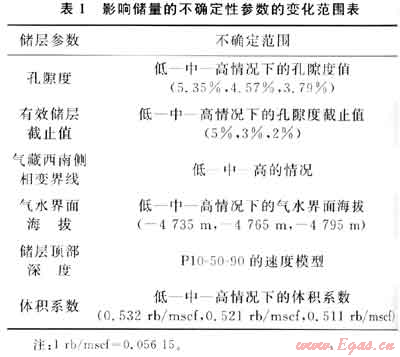 儲層孔隙度在±17%范圍內變化。該變化范圍是根據本區(qū)所有開發(fā)井的非儲層巖層孔隙度的變化范圍計算得來的。表1列出了不確定范圍的主要參數。