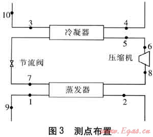 為了研究空調(diào)系統(tǒng)運(yùn)行參數(shù)與故障之間的關(guān)系,挑選出對(duì)故障敏感的運(yùn)行參數(shù),測(cè)點(diǎn)的選擇應(yīng)基于整個(gè)空調(diào)系統(tǒng),包括冷卻水側(cè)、冷水側(cè)及制冷劑側(cè)。由上述理論分析可知,冷水機(jī)組冷凝器水側(cè)受阻將引起蒸發(fā)溫度、冷凝溫度、壓縮機(jī)吸氣溫度、壓縮機(jī)排氣溫度、冷水供回水溫度、冷卻水進(jìn)出水溫度發(fā)生變化,因此應(yīng)對(duì)這些參數(shù)進(jìn)行測(cè)量。測(cè)點(diǎn)的布置見(jiàn)圖3,測(cè)量的參數(shù)名稱、測(cè)點(diǎn)位置及測(cè)量方式見(jiàn)表2。