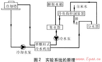 實(shí)驗(yàn)系統(tǒng)的原理見(jiàn)圖2。制冷機(jī)房中設(shè)置單螺桿式冷水機(jī)組、冷水泵和冷卻水泵各1臺(tái),以及分水器和集水器。冷卻水經(jīng)冷卻水泵加壓后進(jìn)入冷水機(jī)組,吸收熱量后被送至屋頂?shù)睦鋮s塔,經(jīng)冷卻降溫后又返回冷水機(jī)組,完成循環(huán)。冷水則是經(jīng)過(guò)冷水泵加壓后進(jìn)入冷水機(jī)組,被冷卻降溫后進(jìn)入分水器,之后進(jìn)入冷負(fù)荷控制裝置中,與自來(lái)水混合后進(jìn)入集水器,再被加壓送入冷水機(jī)組,完成循環(huán)。
