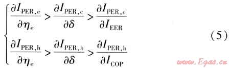 根據(jù)熱泵機(jī)組和燃?xì)鈾C(jī)的運(yùn)行特性可知:燃?xì)鈾C(jī)與壓縮機(jī)的傳動效率ηi≈1,一般ηe<0.4,則1>1-ηe>ηe。由于δ<1,一般IEER、ICOP>2,因此IEER-δ>1,ICOP-δ>1。因此有: