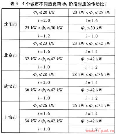 遵循多級傳動比的確定原則,結(jié)合單級傳動比的計(jì)算結(jié)果,針對4個城市的不同熱負(fù)荷階段,確定了采用多級傳動比的燃?xì)鈾C(jī)熱泵的不同傳動比i(即檔位),見表6。