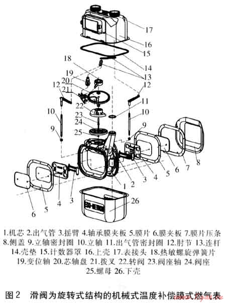 滑閥為旋轉(zhuǎn)式結(jié)構(gòu)的機械式溫度補償膜式燃?xì)獗硎切滦徒Y(jié)構(gòu),體積小,結(jié)構(gòu)簡單緊湊,見圖2。