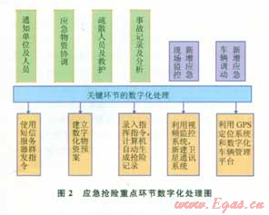 如果采用數(shù)字化指揮,還可以增加幾個(gè)常規(guī)過程所不具備的環(huán)節(jié),圖2是應(yīng)急搶險(xiǎn)關(guān)鍵環(huán)節(jié)的數(shù)字化處理思路。