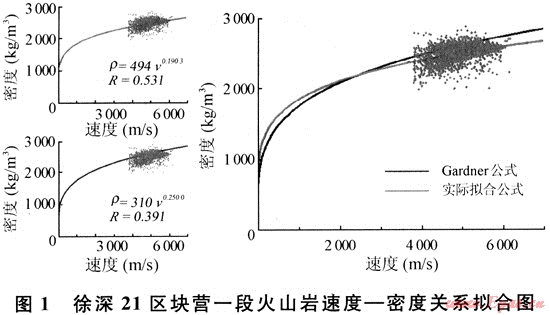 波阻抗等于密度和速度的乘積,而速度與密度存在一定的關(guān)系(如Gardner公式)[9],因此可以通過(guò)擬合密度與速度的關(guān)系,將這種關(guān)系代入波阻抗體中,分離出密度來(lái)。但不能簡(jiǎn)單地套用Gardner公式,因?yàn)镚ardner公式是國(guó)外地球物理學(xué)工作者通過(guò)對(duì)美國(guó)墨西哥灣地區(qū)淺層海相地層中巖心樣品分析得到,它更適合于沉積巖,對(duì)于徐深氣田徐深21區(qū)塊深層火山巖,應(yīng)該根據(jù)實(shí)際情況擬合適用于該區(qū)的公式模型。通過(guò)該區(qū)塊營(yíng)一段火山巖地層的測(cè)井資料,得到如下公式模型(圖1):ρ=494v0.1903,相關(guān)系數(shù)為0.531。然后,通過(guò)Jason軟件Function模塊編寫(xiě)函數(shù),將約束稀疏脈沖波阻抗體轉(zhuǎn)換成密度體。