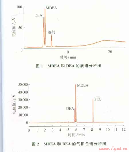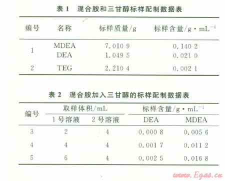 2)待測樣品中加入同樣量的TEG做參比,經(jīng)色譜分析后,求出樣品中DEA、MDEA與TEG色譜峰面積的比值,代入上述線性方程中即可求得待測樣品中DEA、MDEA的含量。